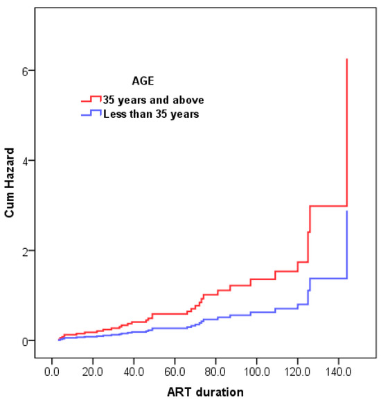 Figure 1 shows that older individuals (≥35 years) have a higher cumulative risk of the event than younger individuals, particularly as ART duration lengthens.