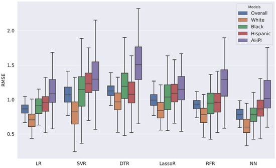 Through machine learning models, the lowest RMSE was found among non-Hispanic Whites, followed by Black, Hispanic, and AHPI individuals. The lowest RMSE was statistically significant compared with the other racial groups (Wilcoxon rank-sum p < 0.01). This implies that machine learning models for cost prediction are biased toward non-Hispanic Whites. The bias is mainly explained by the imbalance in data size. In the authors’ judgment, among the machine learning models used in this study, NN demonstrated the best performance. NN captures non-linear associations between the data extracted from the EHR and the cost.