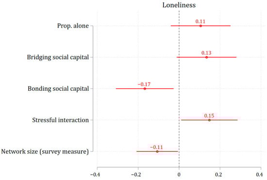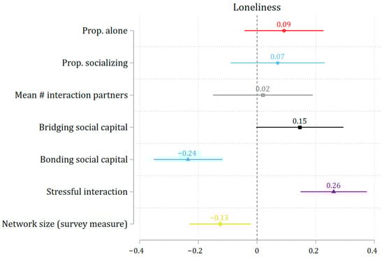 The association between social interactions and loneliness. Note: 95% confidence interval. All social interaction measures are standardized to enable comparison of effect sizes.