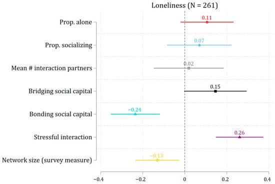 In contrast, qualitative dimensions of social interaction showed significant associations. Lower levels of bonding social capital (β = −0.24, p < 0.001) and higher levels of stressful interactions (β = 0.26, p < 0.001) were both linked to greater loneliness. However, no significant association was observed for bridging social capital (β = 0.15, p > 0.05). Table S1 in the Supplemental Materials provides the full details of the models depicted in Figure 1.