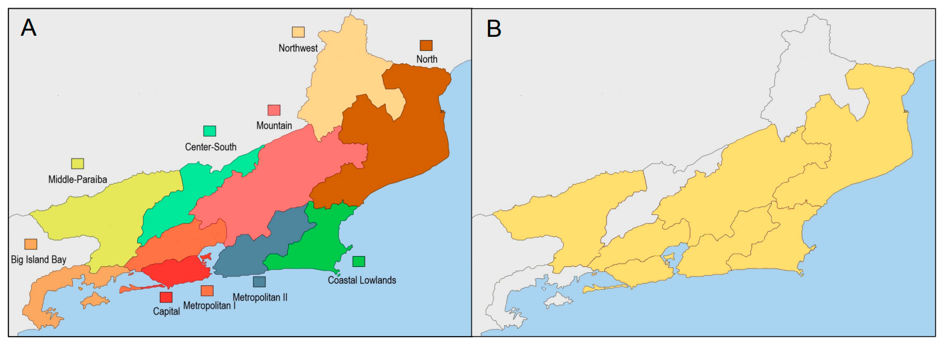 - Governo do Estado do Rio de Janeiro. Diagnóstico de saúde da região baixada litorânea; Secretaria de Saúde: Rio de Janeiro, Brazil, 2020. [Google Scholar]