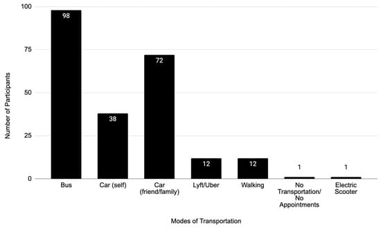 A majority of new or expectant mothers, 67%, did not own or have access to a car. The primary transport mode reported by respondents was the bus (Figure 1). However, most participants (83%) used multiple modes of transportation, with the most common being car (47%), bus (42%), rideshare service (5%), and walking (5%).