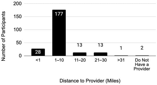 Most respondents (75%) spent between $1 and $10 on one-way transportation costs. For the same proportion, the distance to their primary maternal health provider ranged from 1 to 10 miles (Figure 2). The average one-way travel time for respondents varied widely, from 0 to 79 min, with the most frequently reported travel time being 20 to 39 min (38%).