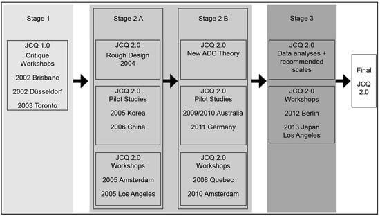 During the development of the JCQ 2.0 in the four countries, items and scales evolved considerably across a span of six years: from Korea in 2005, China in 2006, and Australia in 2009 to Germany in 2011. Therefore, some of the organizational and external scales are only available in the later Australian and German pilots. The JCQ 2.0 development process is graphically presented in Figure 1. It encompassed three stages and started with multiple international workshop meetings with a core of committed researchers that—in Stage 1—compiled all critique regarding the JCQ 1. As a consequence of these considerations, a ‘rough design’ of the new and extended JCQ was formulated in Phase 2. The JCQ 2.0 scales evolved on the basis of two generations of theory: the first set of pilots in Korea and China was based on a rough theory (Figure 1: Step 2A) with expansions based on both creative workshop discussions and the JCQ 2.0 rationale document (available at www.jcqcenter.org, accessed on 3 July 2019). At that stage, only an outline for the need for organization-level Demand, Control, and Support concepts was available. However, there was yet not sufficient detail to generate a fully integrated set of new concepts, scales, and items beyond the task level. Korea provided the first opportunity to test the broader, if basic, JCQ 2.0 scale set with a large urban transit sample (Sung-Il Cho). In Western China, the first representative urban population survey was undertaken (Jian Li).