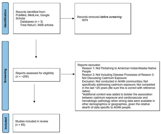All references were derived from broad searches of terms including “cadmium”, “cardiovascular disease”, “congenital heart disease”, “hematologic”, and “American Indian/Alaska Native” in the largest publication databases, including PubMed, MedLine, and Google Scholar, to retrieve the broadest returns given the scoping nature of this review. Specific inclusion criteria required pertinency to AI/AN populations, data explicitly reporting cadmium exposure, not necessarily other heavy metals, and describing effects in cardiovascular and hematologic health. Articles released within the last ten years, with exceptions, were then critically appraised by the authors to determine appropriateness for inclusion in this review, as well as for repeated data. The pertinent articles were then reviewed and summarized in the subsections below. Additional content was added to bolster the association between cadmium exposure and cardiovascular and hematologic pathology when strong data were available in other demographics or geographies, given the relative dearth of data specific to AI/AN people. This strategy is summarized in Figure 1.