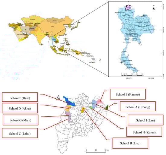 After the development of the criteria, the nine ethnic groups that have a high ranking in Chiang Rai were selected because they represent the largest concentration of an ethnic community in northern Thailand, according to the information of the Princess Maha Chakri Sirindhorn Anthropology Centre [53]. Moreover, there were nine ethnic groups, including the Hmong, Lisu, Lahu, Akha, Kamoo, Haw, Mien, Karen, and Lau groups [9]. Therefore, nine primary schools that represent the largest ethnic populations in Chiang Rai were selected as participants in the study [54], as illustrated in Figure 1, following the purposive sampling for the qualitative analysis. For this sampling, following the relevant studies [49,50], we took care to establish similar characteristics to make representative sampling. Therefore, the criteria included the following: (1) They had a chef to make the school lunch, and (2) they had approximately one hundred ethnic students for each primary school. Hence, the target groups of this study were (1) School A, associated with the Hmong group in Wiang Kaen district; (2) School B, linked to the Lisu group in Muang Chiang Rai district; (3) School C, affiliated with the Lahu group in Muang Chiang Rai district; (4) School D, connected to the Akha group in Mae Fah Luang district; (5) School E, representing the Kamoo group in Chiang Khong district; (6) School F, associated with the Haw group in Mae Fah Luang district; (7) School G, linked to the Mien group in Muang Chiang Rai district; (8) School H, affiliated with the Karen group in Doi Luang district; and (9) School I, connected to the Lau group in Chiang Sean district. Data were collected from these participants for the processes shown below.