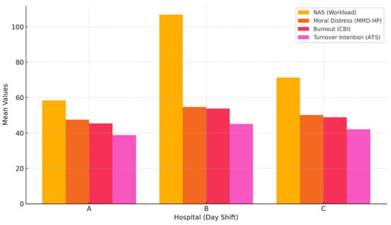 Hospital C occupied an intermediate position with an average NAS workload (D: 71.31; N: 70.85) and a moderate staff shortage (44.0–38.0%), which was also reflected in average moral distress (50.1), burnout (48.9), and turnover (42.1) indicators.