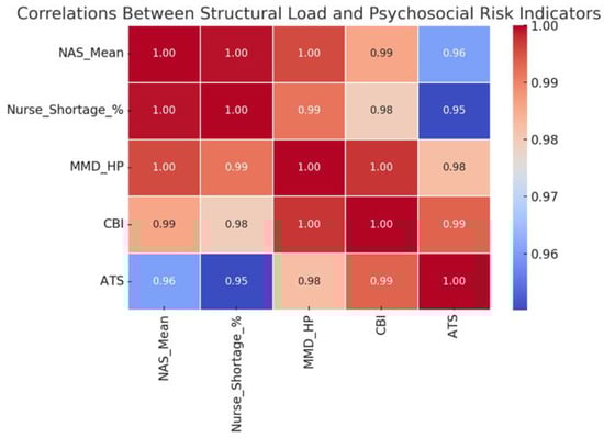 The correlation map in Figure 2 shows the relationship between the structural load indicators (mean NAS and the three main psycho-emotional indicators). Although the number of units analysed is small, the visualisation shows conceptual trends, with higher structural load tending to be associated with increased psycho-emotional risk. This approach allows the identification of systemic factors that can affect the emotional well-being of staff.