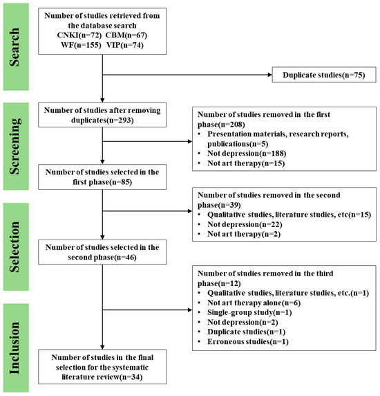 Because this was a systematic literature review, not a human trial (a study using human-derived materials or other studies included in the risk criteria for research), exemption from the review was obtained from the Jeonju University institutional review board on 8 April 2024 before commencing the study. Zheng et al. were the first to implement art therapy interventions and studies to treat Chinese patients with depression [22]. Hence, we selected experimental studies on Chinese patients with depressive disorder published in China between January 2008 and December 2023. Based on the National Evidence-based Healthcare Collaborating Agency (NECA) SLR manual [23] and PRISMA SLR reporting guidelines [24], we selected the research topic and central questions, performed a literature search, selected and classified literature, performed coding, assessed the risk of bias, presented the data analysis and results, and derived our conclusions.