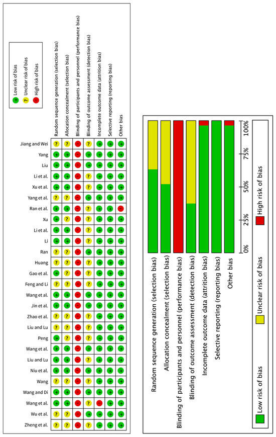 We used the RoB [20] to assess the risk of bias in 27 randomized controlled studies. Random sequence generation was rated as “uncertain” for 10 studies, as the randomization method was not described in detail. Allocation concealment was rated as “uncertain” for 13 studies owing to missing or insufficient description of random sequence allocation. Blinding of participants and personnel was rated as a “high” risk for all 27 studies, as the nature of the interventions meant that the participants or their caregivers could not be completely blinded during the consent process. Blinding of the outcome assessment was rated as “uncertain” for 17 studies, as there was insufficient information to verify whether blinding had been applied. Incomplete outcome data were rated as a “high” risk for one study, as data values were missing. Selective reporting was rated as a “low” risk for all the studies, as the results were reported in accordance with the study design and criteria. Another bias was rated as a “high” risk for one study, as specific details regarding the art therapy program had not been recorded. Table 4 and Figure 2 present the results of the RoB assessment for the randomized controlled studies.
