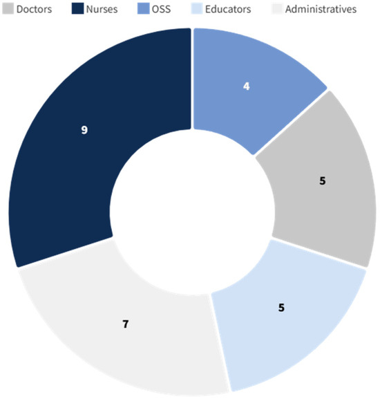 The survey was successfully submitted to a sample of 60 healthcare professionals, equally distributed between Vittore Buzzi Hospital (Milan, Italy) and the Queen Silvia Children’s Hospital (Gothenburg, Sweden). The sample included a broad spectrum of staff roles—physicians, nurses, nursing assistants (OSS), play and education specialists, and administrative personnel—but excluded patients and caregivers (Figure 1 and Figure 2), focusing exclusively on internal perceptions of the built environment.