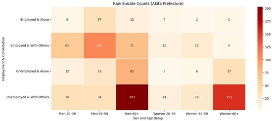 Heatmap of raw suicide counts by demographic group in Akita Prefecture, 2018–2022.