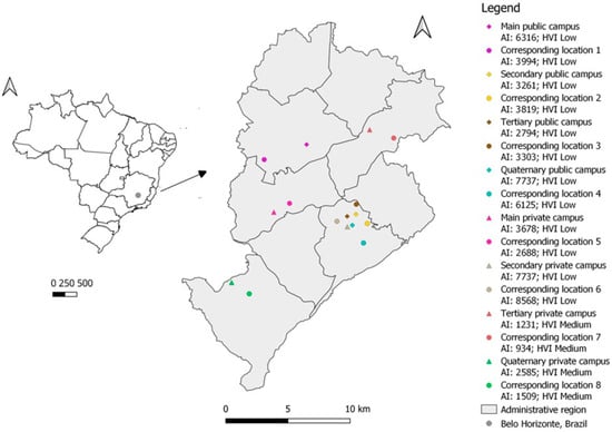 For this study, the addresses of the campuses of the two largest universities in Belo Horizonte were selected: the largest public institution (Federal University of Minas Gerais—UFMG) and the largest private institution (Pontifical Catholic University of Minas Gerais—PUC Minas). UFMG has 33,067 undergraduate students enrolled in on-site courses, 3167 faculty members, and 4694 administrative and technical staff distributed across its four campuses in Belo Horizonte (data provided by UFMG). PUC Minas has 26,514 undergraduate students, 1619 faculty members, and 1960 administrative staff members across its four campuses in the city [22].