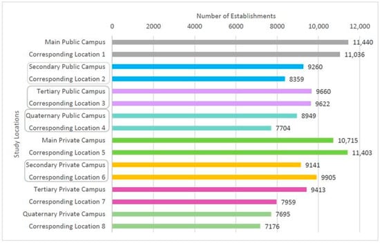Excluding duplicates, the number of establishments delivering to each studied location ranged from 7176 (corresponding location 8) to 11,440 (main public campus). Delivery availability was generally higher at university campuses than at their corresponding locations, except for the main and secondary private campuses. Notably, the main public and private campuses, along with their corresponding peripheral locations (1 and 5), exhibited the greatest delivery coverage. Conversely, tertiary and quaternary private campuses and their corresponding locations (7 and 8), also in non-central areas, did not follow this pattern (Figure 2).