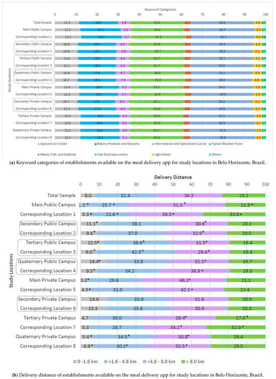 Descriptive analyses were conducted to present the number of establishments and the distribution of keyword categories, delivery distances, and delivery fees for the total sample, as well as stratified by each university campus and its corresponding location. Absolute and relative frequencies were calculated, and 95% confidence intervals (CIs) were estimated for each variable. Differences between university and non-university locations were considered statistically significant when the 95% CIs did not overlap, corresponding to a significance level of 5%. Horizontal bar charts were used to illustrate these results. Complete results, including 95% CIs for each variable, are provided in Supplementary Materials Tables S2–S4. All analyses were performed using Stata software, version 14.0.