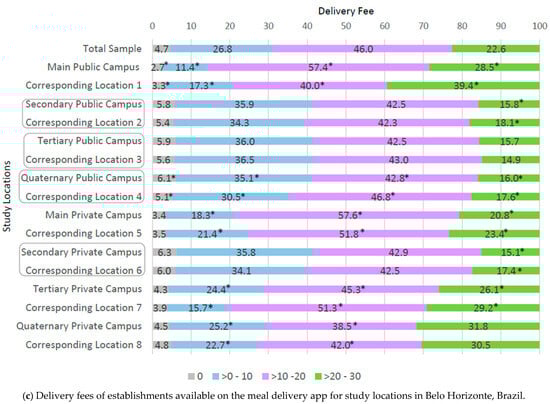 Delivery fees ranged from BRL 0 (free delivery) to BRL 30 (USD 5.72). Only a small proportion of establishments (4.7%) offered free delivery, while most (46.0%) charged BRL 10–20 (USD 1.90–3.81). Free delivery was more common at campuses and corresponding central locations compared to peripheral areas. Higher fees (greater than BRL 20–30; USD 3.81–5.72) predominated at campuses and locations further from the city center, irrespective of public or private status (Figure 3c).
