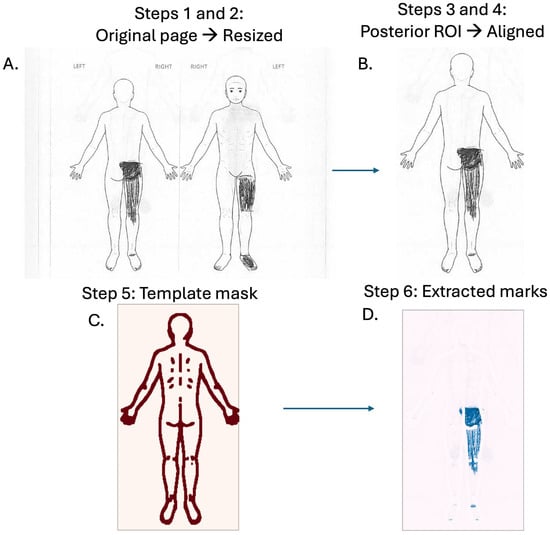 Key stages of the body-map processing pipeline. (A) Original patient page from the pain-drawing questionnaire, converted to grayscale and resized. (B) Posterior region of interest (ROI) extracted and aligned to a standardized template to correct for scale/rotation. (C) Template mask (red) defining the analyzable body surface; pixels outside the mask are excluded from downstream quantification. (D) Extracted patient marks (blue) after normalization and thresholding, used to compute regional coverage and heat maps. Arrows indicate processing flow (left→right, top→bottom); rounded frames are for visualization only.