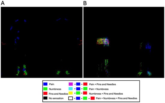 For qualitative illustration, sensation-specific masks were assigned distinct RGB channels (pain = blue, numbness = green, pins-and-needles = red) and merged to generate patient-level composites. Composite images were saved for both anterior and posterior views. For qualitative visualization of overlapping symptom patterns, we converted the sensation-specific binary masks into separate red, green, and blue channels. Pixels corresponding to pain were loaded into the blue channel, pixels corresponding to numbness into the green channel, and pixels corresponding to pins-and-needles into the red channel. By merging these three single-channel images, we produced composite RGB overlays in which regions of mixed symptomatology appear as additive color blends; for example, locations coded as both pain and numbness display as yellow. Patient-level composites were generated for both anterior and posterior silhouettes, written to disk as lossless PNG files, and linked back to each participant’s study identifier for easy retrieval in electronic dashboards. See Figure 2 as an example.