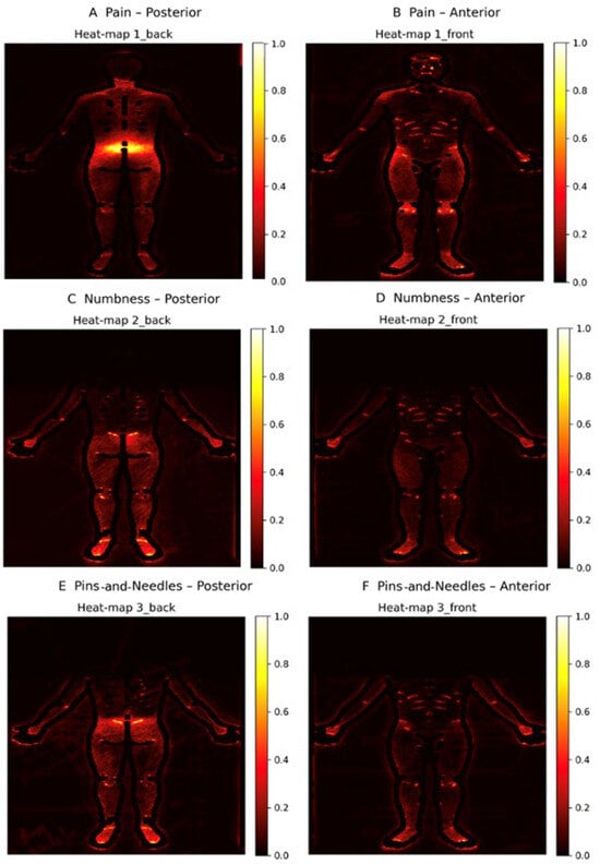 The composite maps we produced, illustrated in Figure 3 and Figure 4, are consistent with the classic topography of chronic low-back pain, including hotspots over the lumbar paraspinal muscles, the gluteal fold, and the posterior thigh. At the same time, the higher spatial resolution reveals under-appreciated clusters of reported numbness and paresthesia along the lateral aspect of the hip, a finding that may reflect peripheral entrapment or radicular involvement. Such detail is virtually impossible to capture with a single 0–10 numeric rating scale, yet it is exactly the kind of granularity required for modern mechanism-based phenotyping that differentiates nociceptive, neuropathic, and nociplastic components and thereby guides more targeted interventions. These results fit within and extend prior body-map quantification work—including standardized instruments such as the Michigan Body Map and newer computational pipelines—and align with evidence that body-map topography indexes sensory-processing phenotypes [] to facilitate reuse and benchmarking across cohorts [,,,].