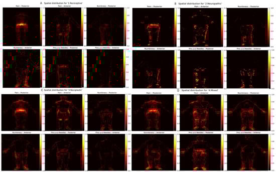 Spatial distributions stratified by pain phenotype for patients with pain phenotype determined (286/332). Cohort heat maps for nociceptive, neuropathic, nociplastic, and mixed groups are shown for posterior and anterior views (per-panel N indicated). Color scale reflects normalized frequency (0–1). Phenotype categorization was derived from a slightly modified version of the well-validated PainDETECT survey. (A) Spatial distribution for “1: Nociceptive”; (B) Spatial distribution for “2: Neuropathic”; (C) Spatial distribution for “3: Nociplastic”; (D) Spatial distribution for “4: Mixed”.
