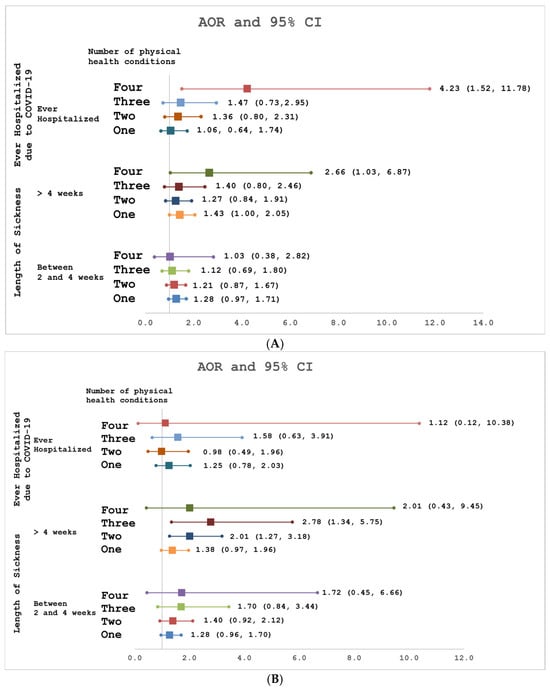 Among rescue and recovery workers, having post-9/11 diabetes (AOR: 1.57, 95% CI: 1.02–2.41) was associated with being sick with COVID-19 for >4 weeks compared to <2 weeks. Only having a post-9/11 respiratory condition (AOR: 2.16, 95% CI: 1.38–3.39) was associated with being hospitalized for COVD-19. Having all four physical conditions post-9/11 versus none was associated with being sick for >4 versus <2 weeks after SARS-CoV-2 infection (AOR: 2.66, 95% CI: 1.03–6.87) and being hospitalized for COVID-19 (AOR: 4.23, 95% CI: 1.52–11.78) (Figure 2A).