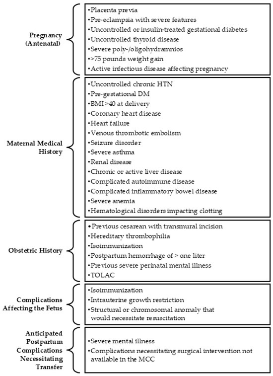 - American Association of Birth Centers; Association of Women’s Health, Obstetric and Neonatal Nurses; American College of Obstetricians and Gynecologists; Society for Maternal-Fetal Medicine; Kilpatrick, S.J.; Menard, M.K.; Zahn, C.M.; Centers for Disease Control and Prevention’s; Callaghan, W.M. Obstetric care consensus #9: Levels of maternal care: (Replaces obstetric care consensus number 2, February 2015). Am. J. Obstet. Gynecol. 2019, 221, B19–B30. [Google Scholar] [PubMed]
