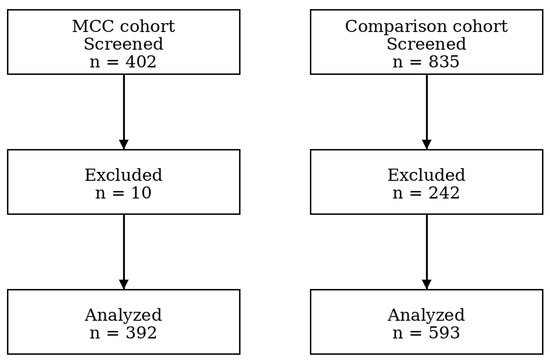 The MCC catchment area was defined using the patient panels of five proximate prenatal clinics in the same county whose patients delivered at the MCC after its opening, including the county health department, a federally qualified health center with two locations in the county, and two local family medicine clinics affiliated with the hospital system. The data for the comparison cohort was provided by the Perinatal Research Service Center (PRSC) at the School of Medicine at the suburban tertiary care facility. The PRSC used Structured Query Language to extract data from the facility’s health data warehouse, and then systematically derived information from the EHR using clinical business rules approved by facility clinicians which guarantees that the data elements in the integrated data set have data lineage back to Epic’s Caboodle and Clarity databases. After receiving these data on 835 unique deliveries, the research team used ICD-10 codes to define the risk status of each patient on admission to labor and delivery using the exclusion criteria adopted by the Level 1 (basic care to people with low-risk pregnancies) MCC at its opening. We conducted an EHR chart review to exclude patients who would not have met the criteria for admission as a low-risk delivery to the MCC had the unit been available at the time (Figure 1). Of the 835 patients, 242 were excluded from the comparison sample using these inclusion and exclusion criteria. These criteria were also used post hoc to exclude patients who delivered at the MCC emergently, but who did not meet the criteria for delivery at a Level 1 MCC (e.g., breech presentation or preterm delivery <37 weeks’ gestation). Of the 402 MCC patients described in Table 1, 10 were excluded from the quantitative outcome analysis because they would not have met the criteria for a Level 1 delivery (Figure 2).