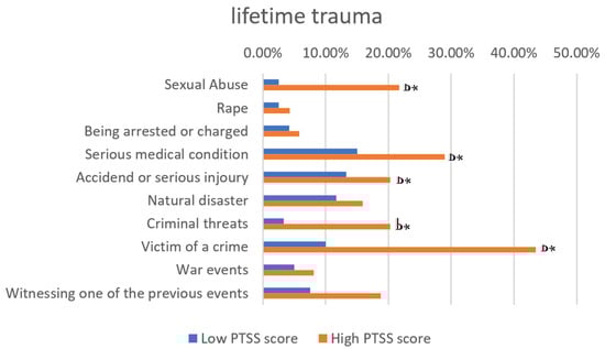 Types of trauma to which the study participants reported exposure. * p ≤ 0.050.