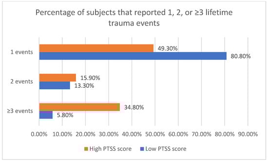 Individuals in the High PTSS score group were more likely to report a greater lifetime exposure to trauma compared to those with a lower PTSS score. Specifically, 34.8% of individuals in the High PTSS score group reported experiencing three or more events (Figure 2).