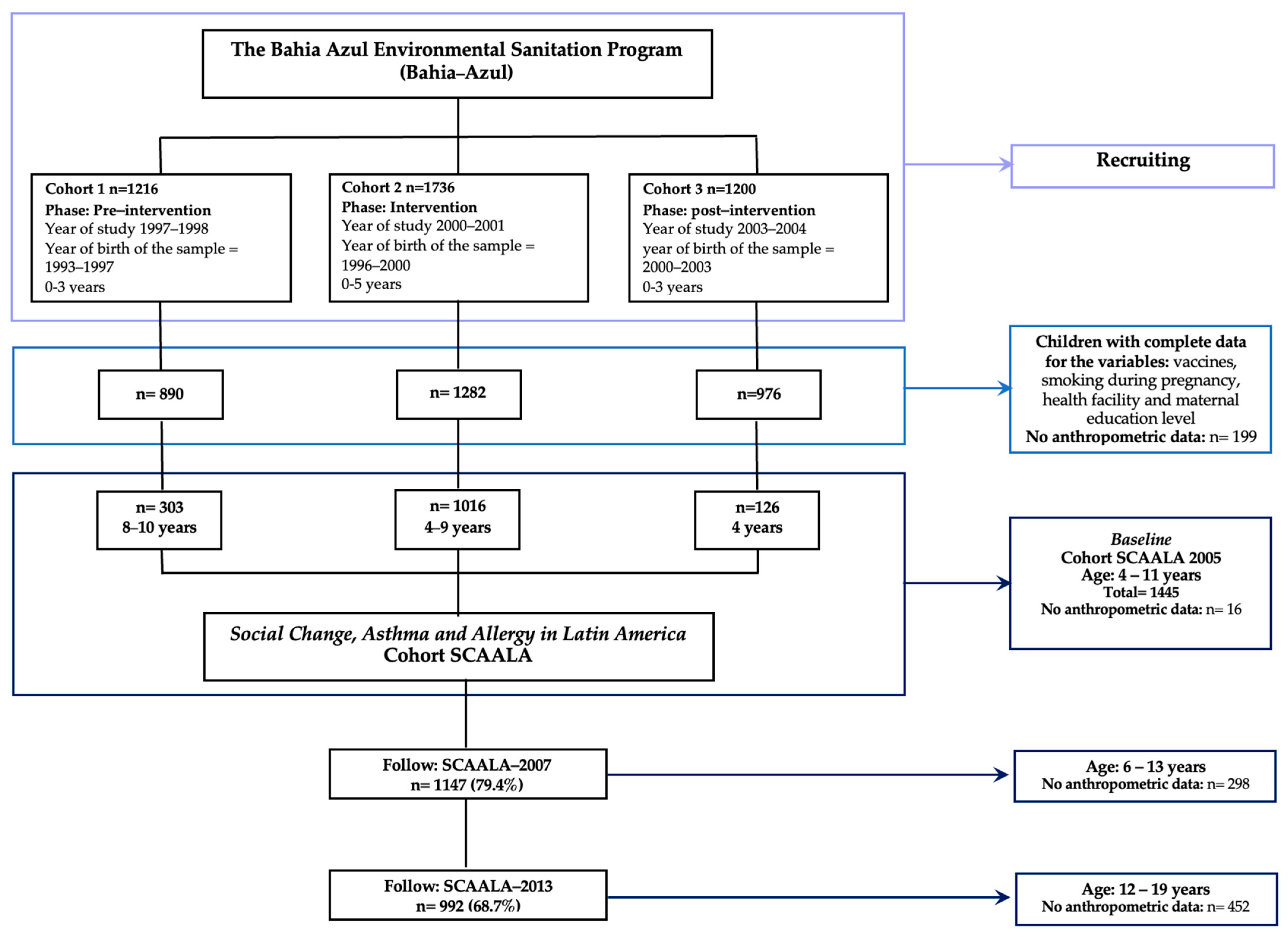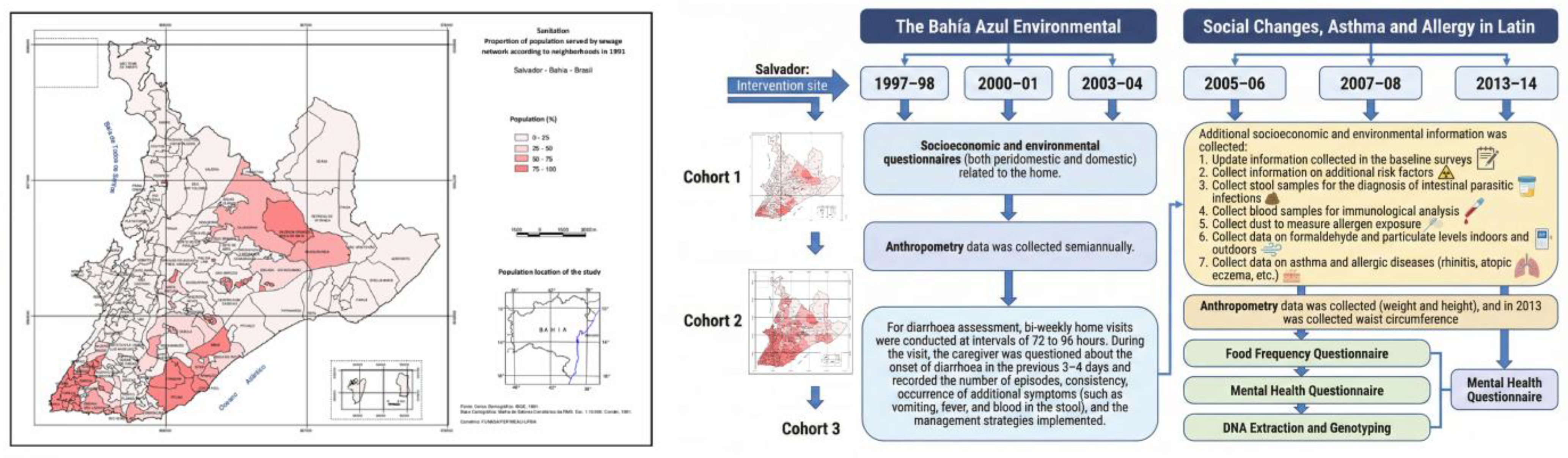 - Barreto, M.L.; Cunha, S.S.; Alcântara-Neves, N.; Carvalho, L.P.; Cruz, Á.A.; Stein, R.T.; Genser, B.; Cooper, P.J.; Rodrigues, L.C. Risk Factors and Immunological Pathways for Asthma and Other Allergic Diseases in Children: Background and Methodology of a Longitudinal Study in a Large Urban Center in Northeastern Brazil (Salvador-SCAALA Study). BMC Pulm. Med. 2006, 6, 15. [Google Scholar] [CrossRef]