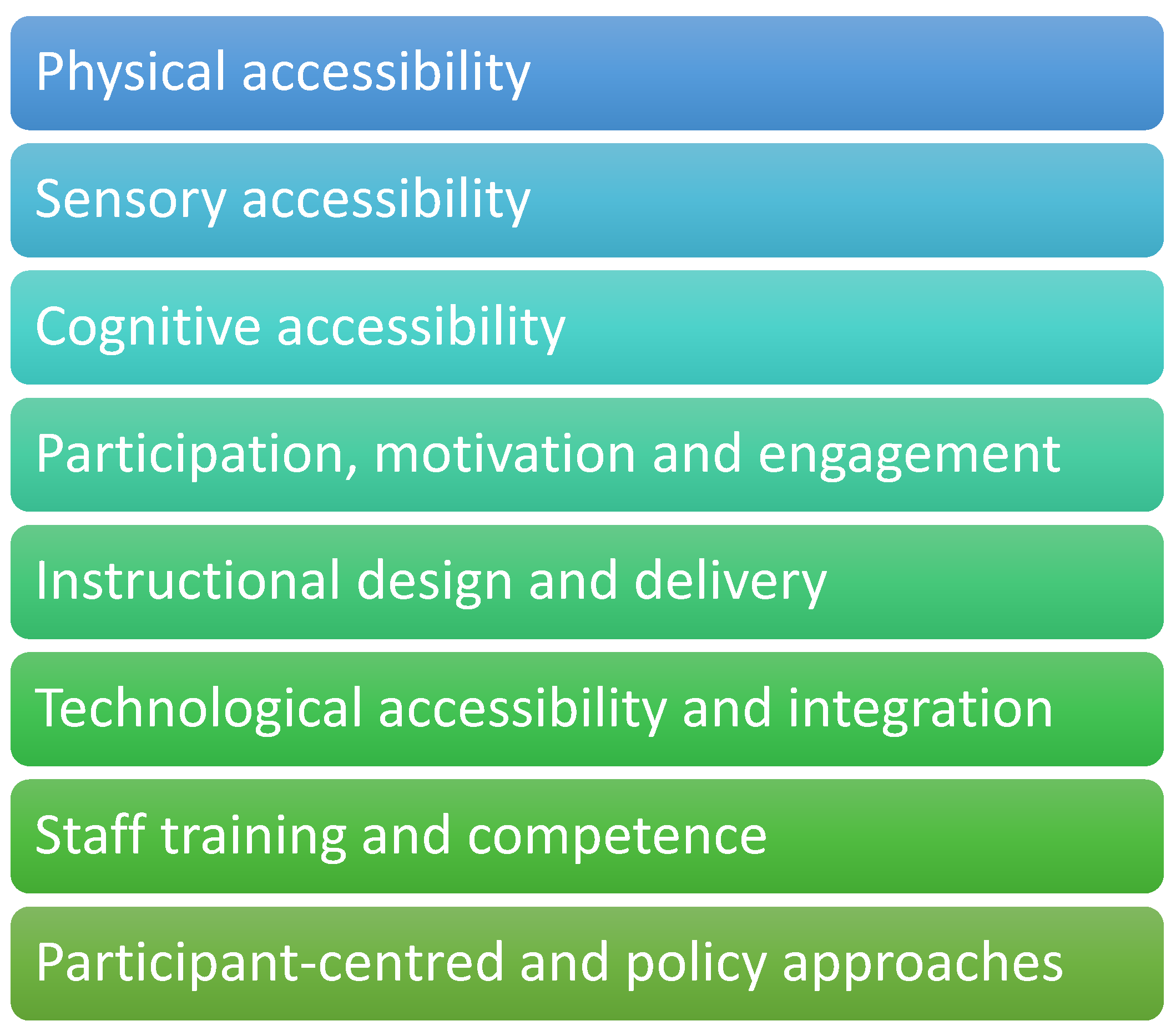 | Staff Training and Competence | Instructor competence is central to inclusion. Professionals should be trained in disability awareness, adaptive teaching, and assistive technology use. Empathy, flexibility, and collaboration foster supportive environments, while ongoing professional development ensures responsiveness to emerging inclusive practices. “She [therapist] took time to listen and adapt the instructions, that gave me confidence. Without that I would have given up.” (stroke) |