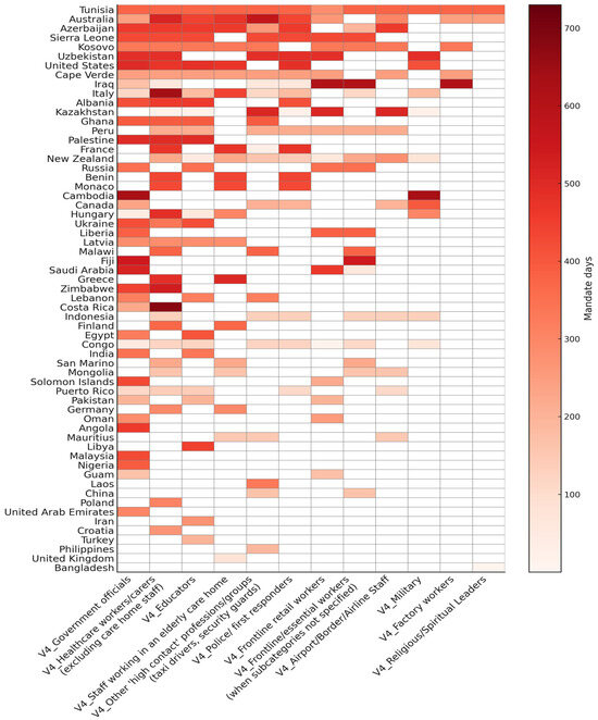 Heatmap of workplace vaccination mandates by countries and employment sectors, with colour intensity corresponding to the number of days that a sector mandate was in place in 2021–2022 (max. 730 days). Countries are sorted from top to bottom by declining mandate intensity; sectors are sorted from left to right by a corresponding metric of country counts and mandate durations. Data source: OxCGRT [24]. Countries that had no workplace mandates according to OxCGRT are not shown. Note that countries are defined by OxCGRT based on “de facto controlling authority of a jurisdiction without prejudice to conflicting authority claims” ([26], p. 71).