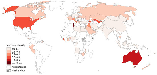 Geographic distribution of COVID-19 workplace vaccination mandate intensity (calculated as the relative number and duration of employment sector mandates in 2021–2022). Data source for index calculation: OxCGRT [24]. Note that countries are defined by OxCGRT based on “de facto controlling authority of a jurisdiction without prejudice to conflicting authority claims” ([26], p. 71). Geographic data source: Natural Earth, free vector and raster map data @ naturalearthdata.com.