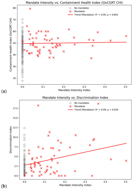 Workplace mandate intensity also correlated positively (R2 = 0.15, p < 0.001) with Rinner et al.’s [39] discrimination index, a measure based on the difference in mobility and access restrictions applied to unvaccinated vs. vaccinated individuals. When limited to the 61 countries with workplace mandates, the relationship further weakens but remains significant (R2 = 0.09, p = 0.020). The point distribution in the scatterplot in Figure 4b suggests that some governments and public health authorities implemented complementary policies marginalizing individuals who did not receive a COVID-19 vaccine.