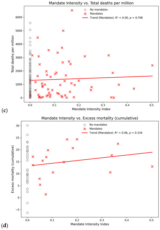 The correlations of workplace vaccination mandates with two key public health outcomes were positive but not statistically significant; see Table 2. In these cases, the upward slopes of the trendlines in Figure 4c,d are “unexpected” (see also [40]), that is, a public health measure (workplace vaccination mandates) is associated with the opposite outcome of what it was intended to achieve. For example, countries with more intense workplace mandates tended to have higher excess mortality, and this relationship became stronger (albeit on a very low level) when focusing on the 61 countries with non-zero mandate intensity. The high p-values (>0.05), however, indicate that workplace vaccination mandates did not have demonstrable negative (nor positive) impacts on total recorded COVID-19 deaths by 31 December 2022 nor on cumulative excess mortality by the same date.
