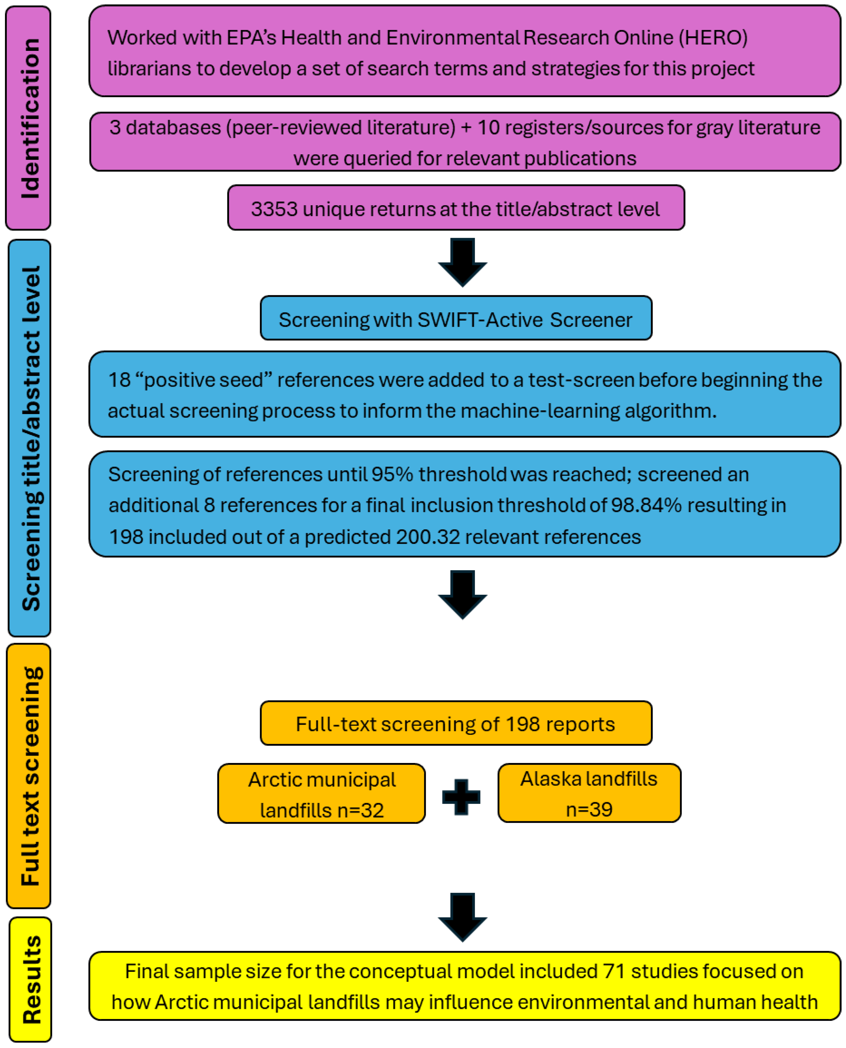 | PubMed | (((“Open landfill”[tw] OR “Dump sites”[tw] OR “Dumpsites”[tw] OR “Open Dump”[tw] OR “Unlined landfill”[tw] OR “Class III landfill”[tw] OR “E-waste”[tw] OR “electronic waste”[tw] OR “Solid waste”[tw] OR “Solid waste disposal”[tw] OR “Household hazardous waste”[tw] OR “Hazardous waste”[tw] OR “Human waste”[tw] OR “Honeybucket”[tw] OR “Construction waste disposal”[tw] OR “demolition waste disposal”[tw] OR “Ash”[tw] OR “Mixed waste”[tw] OR “Leachate”[tw] OR “Lagoon”[tw] OR “holding pond”[tw]) AND (“Alaska”[tw] OR “Arctic”[tw] OR “Rural”[tw] OR “Indigenous”[tw] OR “Cold region”[tw] OR “Alaska Native Village”[tw] OR “Alaska Tribe *”[tw] OR “Alaska Tribal”[tw] OR “Indian land *”[tw])) AND 1980:3000 [dp]) | 10 December 2021 788 results HERO Import Batch ID: 45090 |