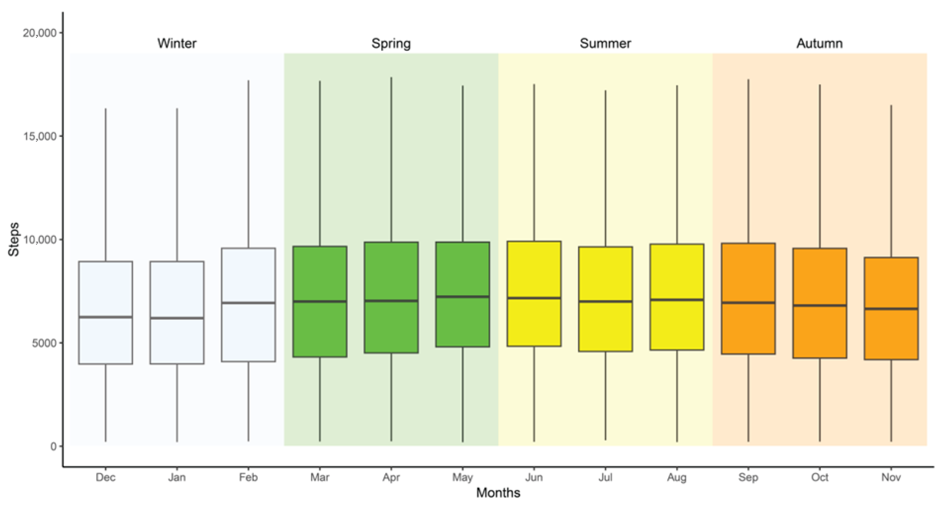 - Tucker, P.; Gilliland, J. The Effect of Season and Weather on Physical Activity: A Systematic Review. Public Health 2007, 121, 909–922. [Google Scholar] [CrossRef]