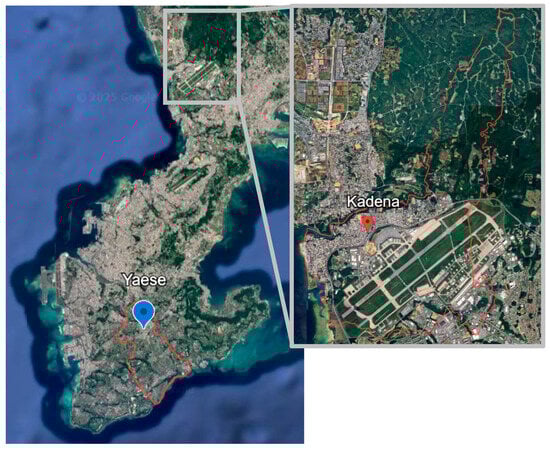 Town map of Kadena and Yaese. The area indicated by the red pin shows the town Kadena, which contained the high- and low-exposure communities. The area indicated by the blue pin shows the town Yaese, which contained the no-exposure community. The map was created by the authors using Google earth (URL https://earth.google.com/earth/d/1fGl6OoLincPxU15pQk6SYvKcZO7yh-Kp?usp=sharing) (accessed on 30 October 2025).