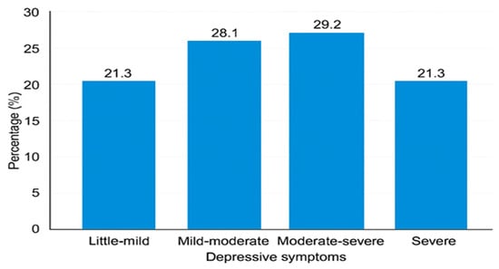 Figure 1 presents the prevalence of caregivers’ depressive symptoms. The highest proportion of caregivers (29.2%) experienced moderate-to-severe depressive symptoms, indicating a considerable mental health burden among caregivers. The second highest group (28.1%) reported mild-to-moderate symptoms, suggesting that many caregivers experience some degree of emotional distress even if not clinically severe. Little-to-mild and severe symptoms were reported equally at 21.3% each, reflecting that while some caregivers cope relatively well, a similarly significant proportion experience severe depressive symptoms.