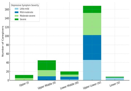 Figure 3 illustrates the distribution of depressive symptom severity among caregivers across different socioeconomic classes. A significant association was observed between socioeconomic status and depressive symptom severity (p < 0.001). Caregivers in the upper (I) and upper-middle (II) classes exhibited the highest proportions of severe depressive symptoms (58.3% and 48.9%, respectively), indicating considerable psychological distress despite their higher economic standing. In contrast, caregivers in the upper-lower (IV) class, representing the majority (66.4%), displayed a wider spread of depressive symptoms, with nearly one-third experiencing mild-to-moderate (33.3%) and moderate-to-severe (29.8%) symptoms. The lower-middle (III) group showed a similar trend of moderate symptom distribution, while those in the lower (V) class, although few (3.2%), predominantly reported little-to-mild depressive symptoms (75%). The overall pattern suggests that depressive symptom burden varied significantly by socioeconomic class, with unexpectedly higher severity among caregivers of higher socioeconomic standing.