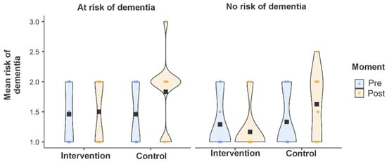 The intervention also had a positive influence on participants’ dementia risk. The analysis revealed that, at the pre-intervention stage, the intervention group presented an odds ratio (OR) of 1.81 for dementia risk, which decreased to 0.5 after the period of educational intervention. This difference between the intervention and control groups was significant only at the post-intervention stage (p = 0.001), highlighting the effectiveness of the intervention in reducing this risk, as illustrated in Figure 2.