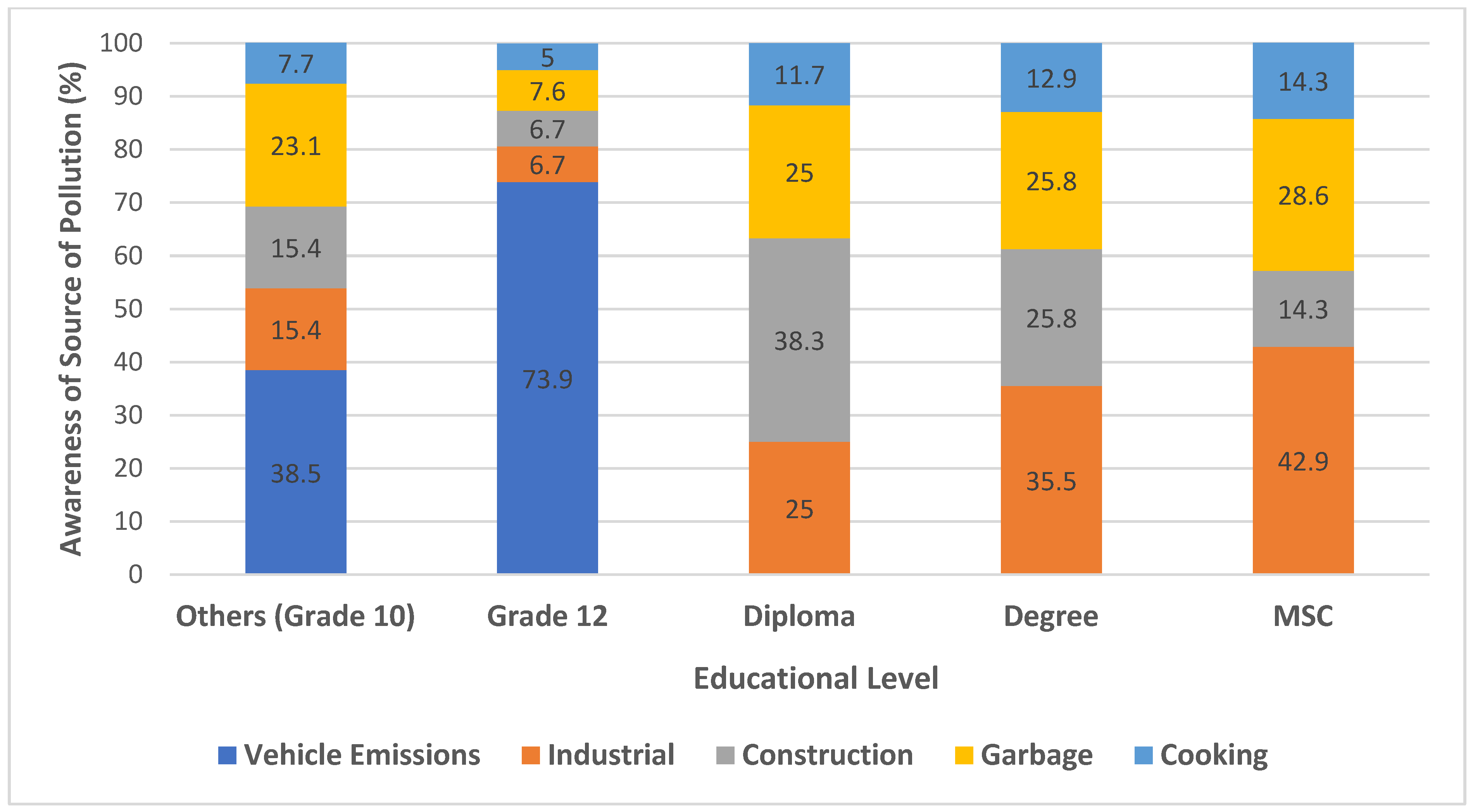 Figure 2. Across all educational levels, vehicle emissions were consistently identified as the primary contributor, with 73.9% of grade 12 and 38.5% of grade 10 respondents reporting it as a major source. In contrast, respondents with higher educational attainment (diploma, degree, MSc) prioritized industrial and construction-related pollution over vehicle emissions, indicating a more nuanced understanding of drivers of pollution sources.