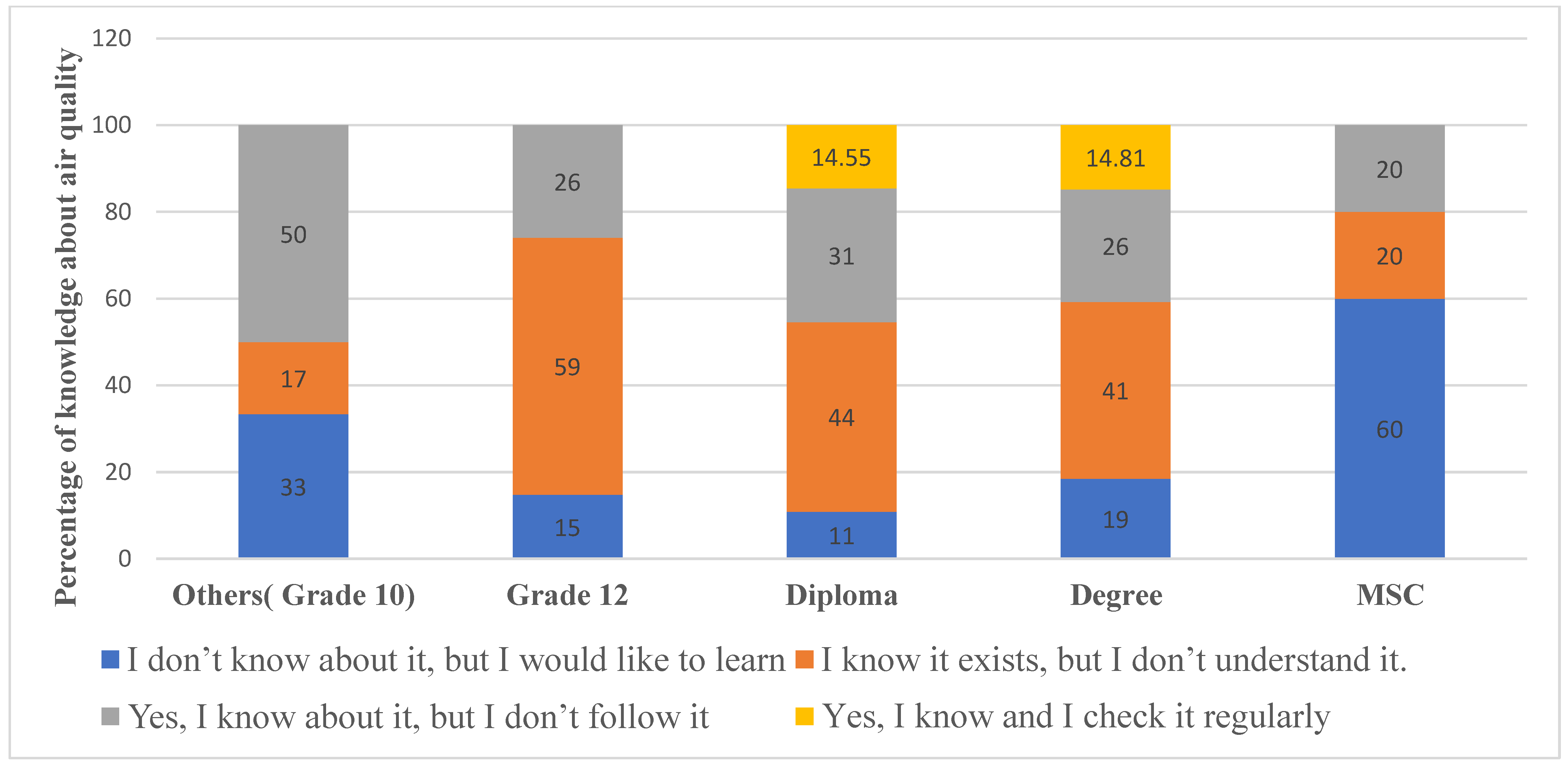 Figure 3). The results showed that awareness increased with educational level, but regular engagement remained limited. Among grade 10 officers, 16.67% were aware without understanding, 50% knew of AQI but did not follow it, and none monitored it regularly. Grade 12 officers showed slightly higher engagement, with 25.93% checking AQI occasionally. Diploma (equivalent to associate degree in community colleges) and degree (bachelor’s degree) holders demonstrated more consistent engagement, with 14–15% monitoring AQI regularly. MSc respondents expressed the highest lack of awareness or understanding (80% total), and none monitored AQI regularly. Interestingly, the MSc respondents deviate from this general pattern, showing the highest lack of awareness despite their educational attainment. Overall, the majority of participants were aware of AQI, although understanding and regular engagement were limited. This suggests that education level alone may not guarantee better understanding or engagement with AQI information.