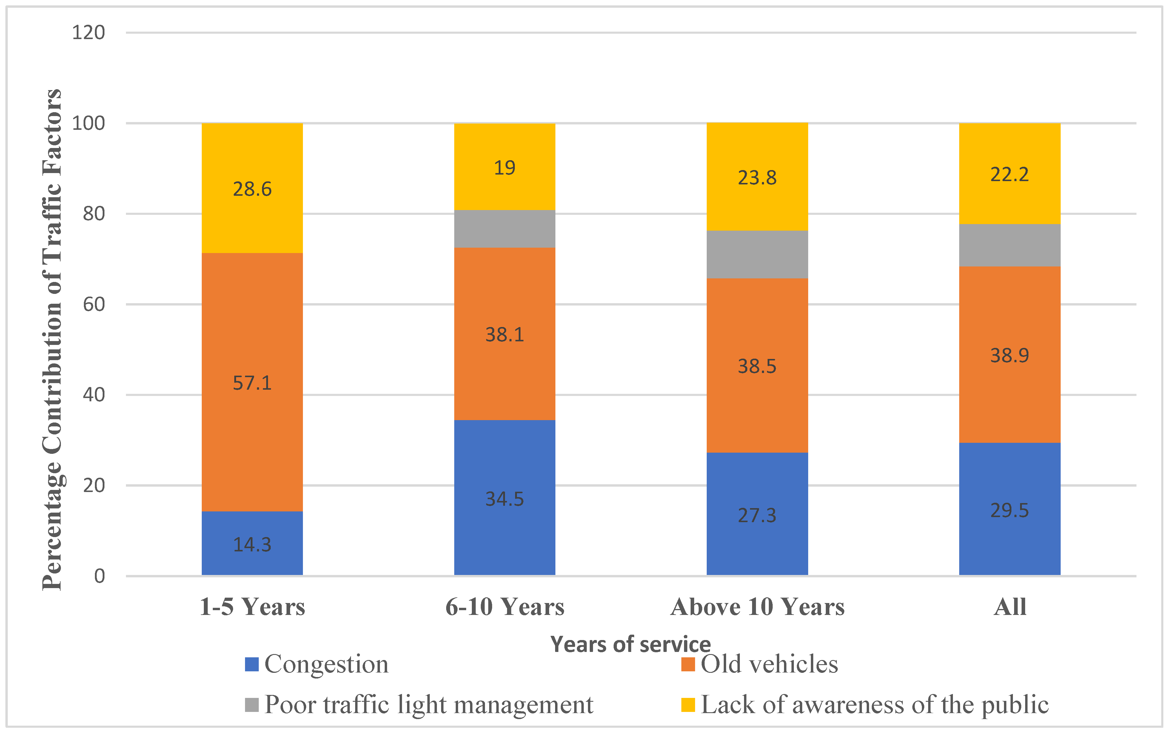 Overall, the findings suggest that longer service is associated with broader recognition of multiple pollution sources and underlying causes, with persistent concern about old vehicles and congestion. Interventions should prioritize phasing-out aging vehicles through stricter inspection regimes, emissions testing, and fleet renewal incentives. Congestion reduction strategies—including improved public transport, dynamic traffic management, and anti-idling enforcement—are also essential. Upgrading signal systems and building traffic management capacity could reduce infrastructure inefficiencies. Finally, public awareness campaigns, supported by strong enforcement and fuel quality standards, remain critical for long-term behavioral change and emission reduction.