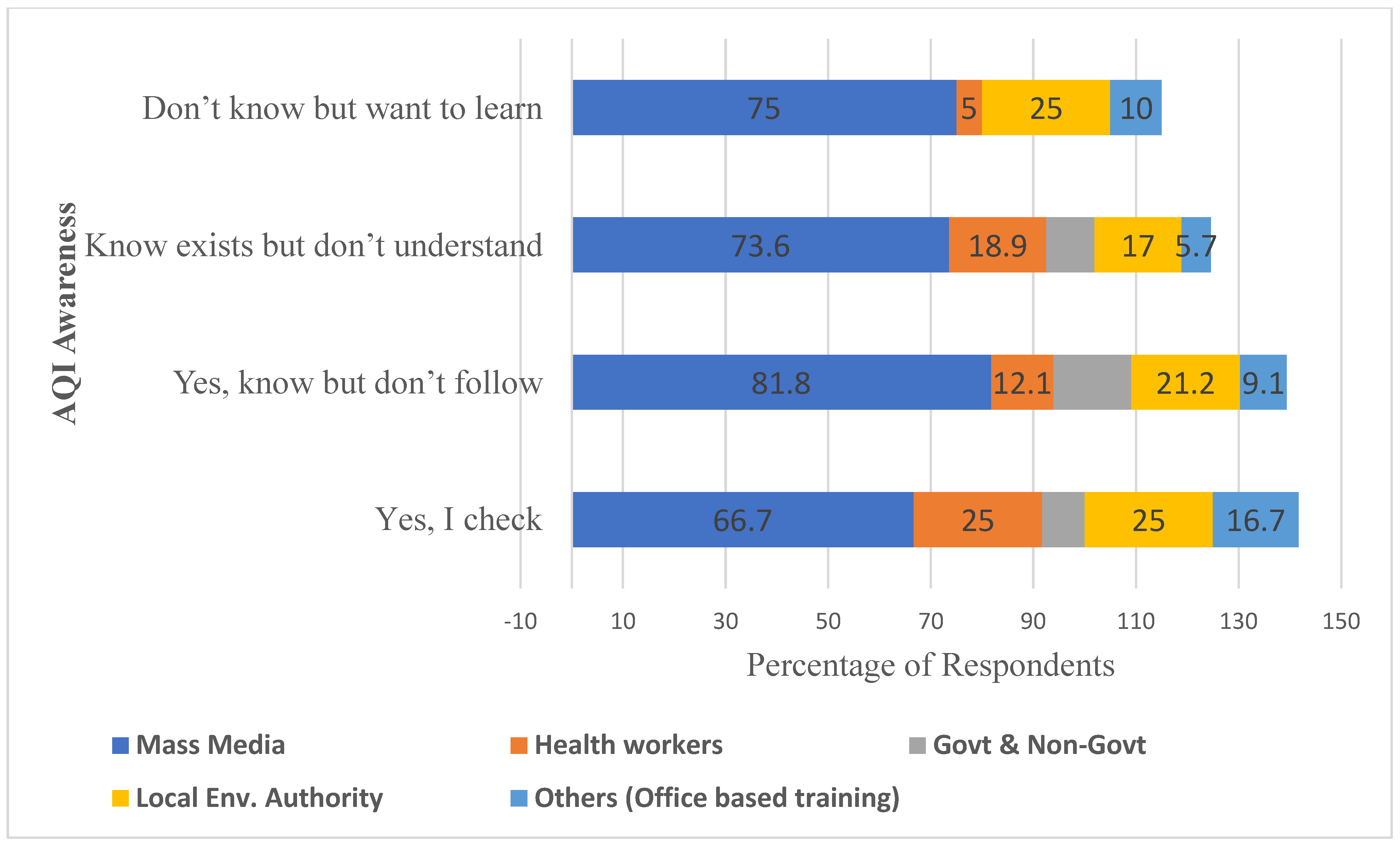 Understanding where officers obtain AQI information and how this varies by awareness level also offers broader implications for designing public education on air pollution. Mass media was the most frequently reported information source for air pollution for traffic police officers, ranging from 66.7% among those who “know and follow AQI regularly”, 81.8% those who know but do not follow, 73.6% of the officers who know it exists but do not understand, and 75.0% of those who do not know but want to learn.