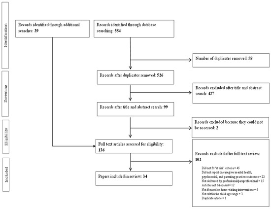 Articles were included if they: (1) administered a home visiting intervention; (2) included participants who were pregnant and/or families/caregivers of young children (children aged 0–4 years 11 months or the average study sample age was below 5.5 years); (3) had a sample comprised of caregivers experiencing mentally ill health, substance issue difficulties, family violence, and/or child protection issues; (4) were available in English; and (5) evaluated, using either a standardised measure or qualitative feedback, outcomes related to caregiver mental health, psychosocial needs, and/or parenting practices (i.e., behaviours that parents engage in to care for their child). Of note, while a home visiting intervention had to be administered and a caregiver outcome evaluated, the intervention did need to be specifically designed to target caregiver outcome. That is, the caregiver outcome could have been measured as a secondary outcome.