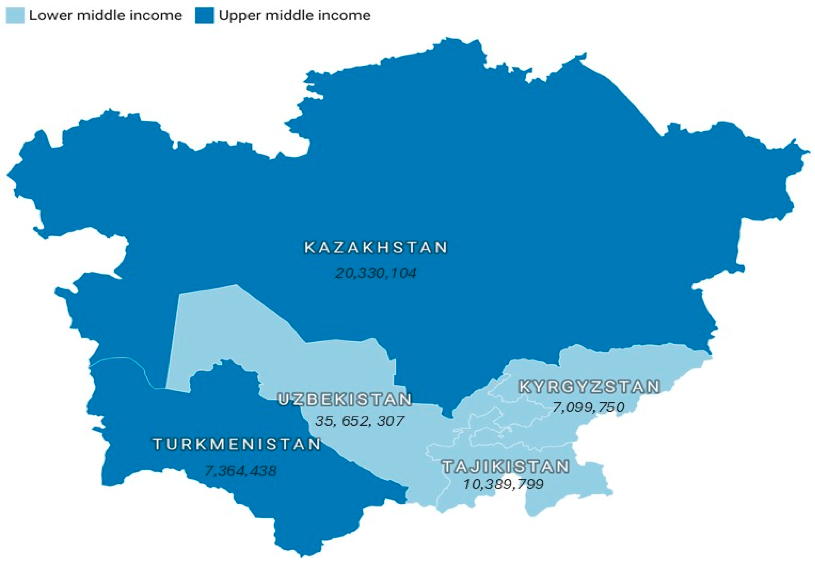 | Kazakhstan | Kyrgyzstan | Tajikistan | Turkmenistan | Uzbekistan | |