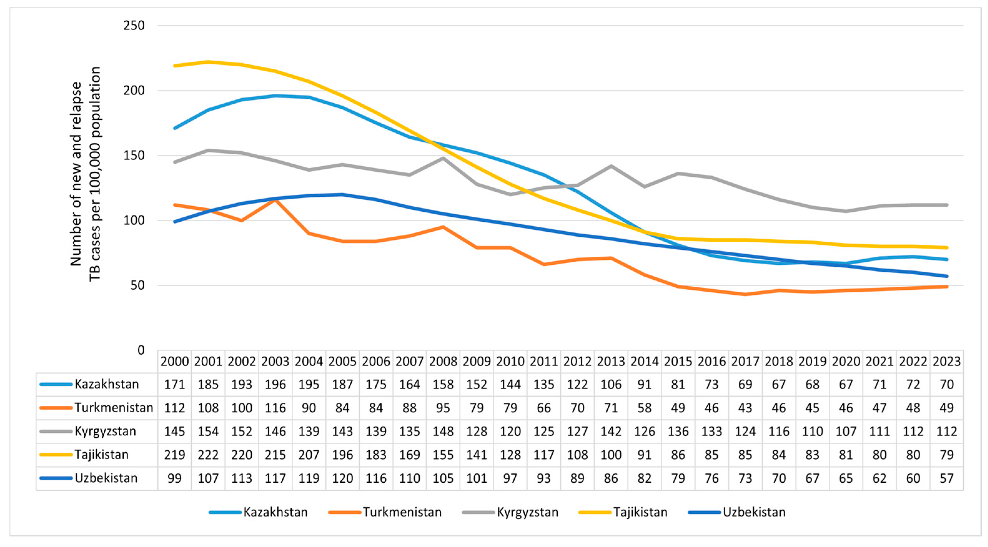 - Sakko, Y.; Madikenova, M.; Kim, A.; Syssoyev, D.; Mussina, K.; Gusmanov, A.; Zhakhina, G.; Yerdessov, S.; Semenova, Y.; Crape, B.L.; et al. Epidemiology of tuberculosis in Kazakhstan: Data from the Unified National Electronic Healthcare System 2014–2019. BMJ Open 2023, 13, e074208. [Google Scholar] [CrossRef]