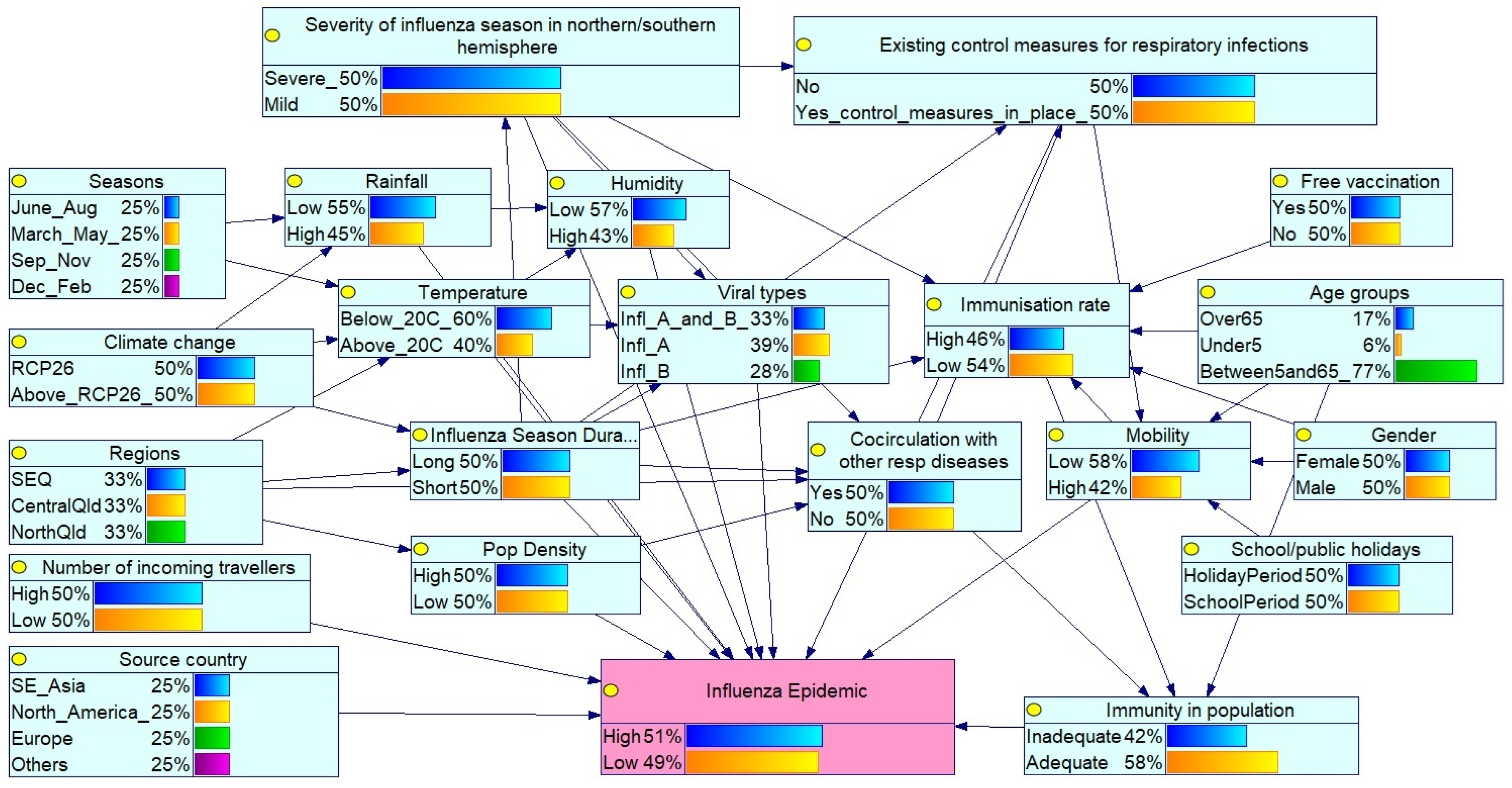 Figure 1. Bayesian network for influenza epidemic risk assessment in Queensland (baseline scenario). Light blue: indicates the influencing factors; Pink: indicates the outcome variable (Influenza Epidemic).