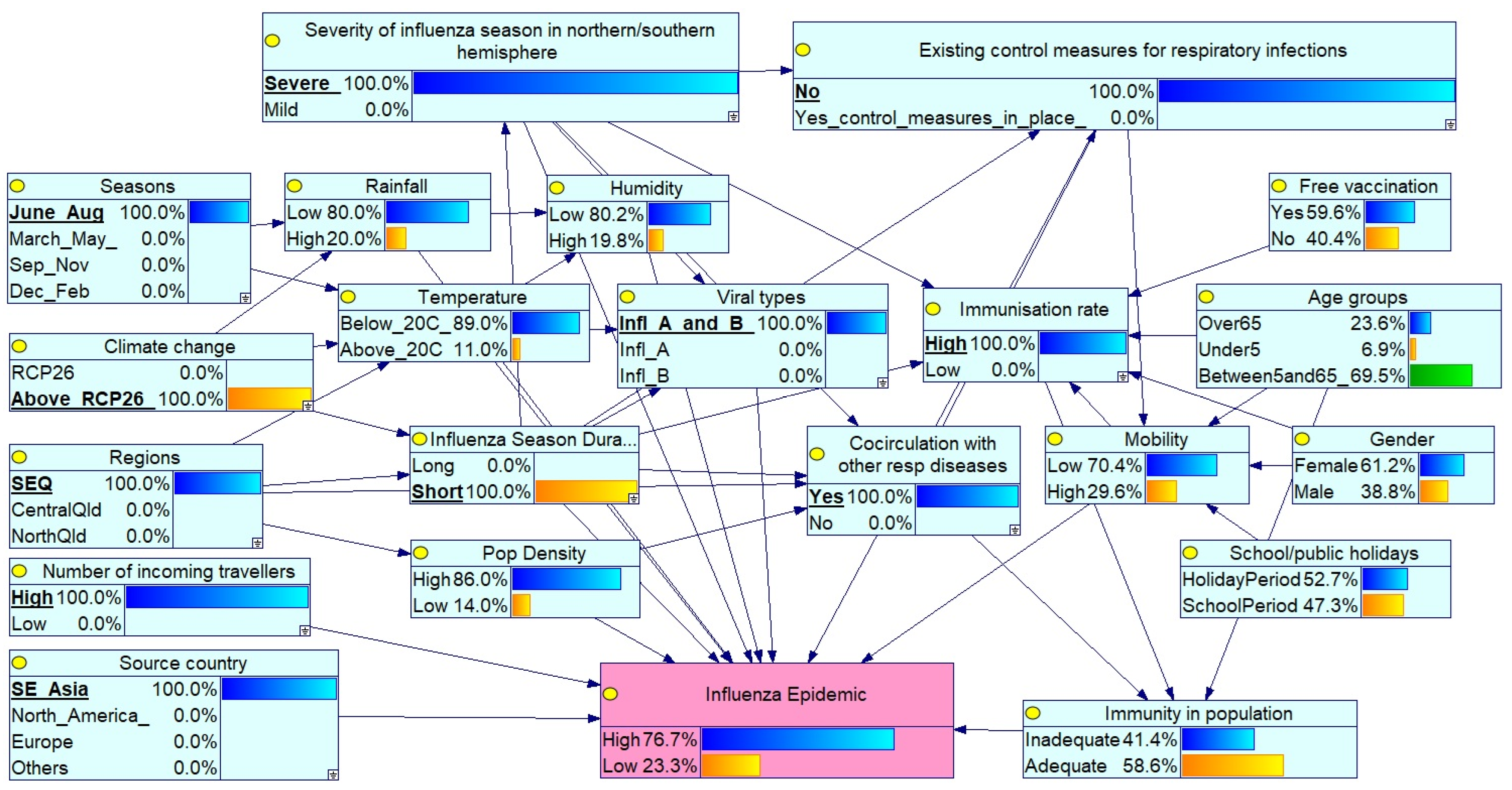 The Bayesian network (Figure 1) models the probability of an influenza epidemic in Queensland (Qld), Australia, based on a set of interdependent factors. The network’s structure, visualised as a directed acyclic graph, illustrates the probabilistic relationships among variables. The arrows in the network depict the conditional dependencies, showing how the change in one variable influences the likelihood of others.